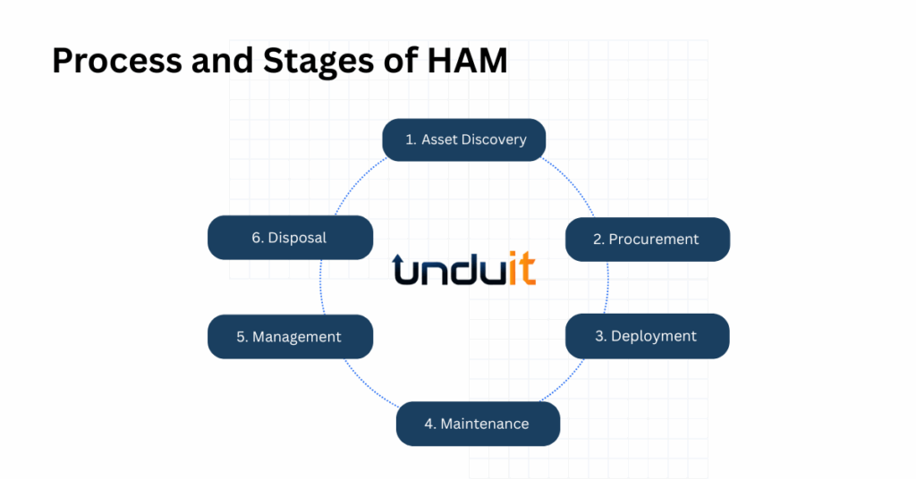 - HAM process stages involve discovery, procurement, deployment, maintenance, inventory, tracking, and responsible retirement.