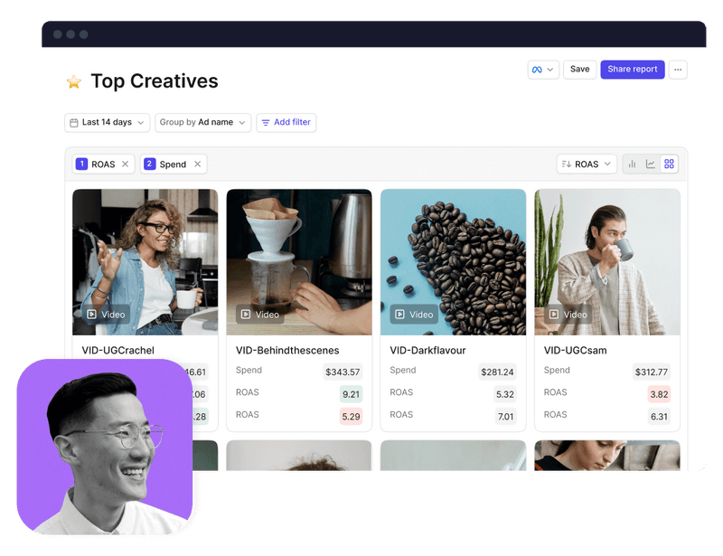 Group ads with common attributes to find actionable insights on what works. No manual reporting required.